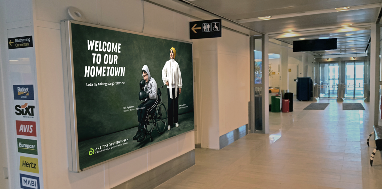 The Swedish Employment Agency put a twist on the country’s iconic Welcome to my hometown photo series that has welcomed passengers arriving in Stockholm’s Arlanda Airport since 2005. Adapting its widely-recognized tagline to feature portraits of successful Swedish professionals with disabilities, these ads communicate to employers that talent and professional capability can be found anywhere, even among individuals they might not expect it from.